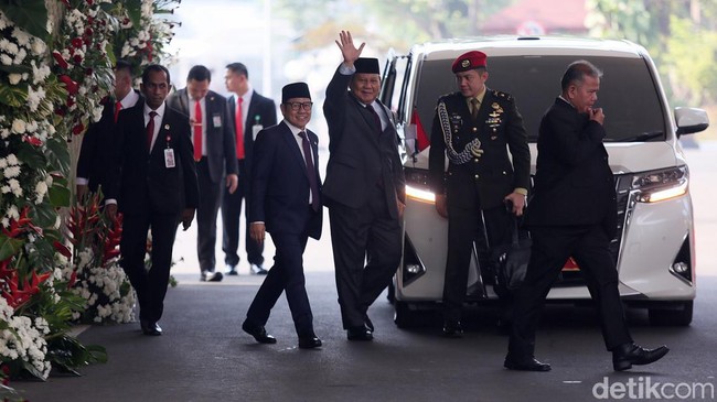 Jakarta - Menhan Prabowo Subianto dan Wakil Ketua DPR Muhaimin Iskandar tiba bersama di Gedung DPR jelang Sidang Tahunan 2023. Keduanya juga kompak memakai setelan jas.