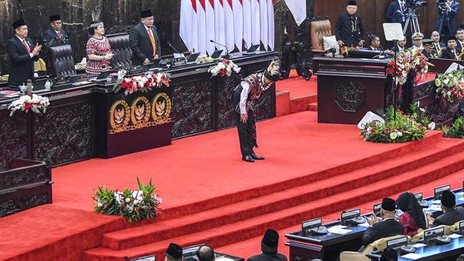 Presiden Joko Widodo menundukkan badan untuk memberi hormat kepada peserta sebelum menyampaikan pidato kenegaraan pada Sidang Tahunan MPR dan Sidang Bersama DPR - DPD Tahun 2023 di Gedung Nusantara, Kompleks Parlemen, Senayan, Jakarta, Rabu (16/8/2023).