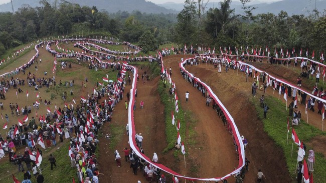 Foto Udara Pembentangan Bendera Merah Putih Terpanjang di Jabar