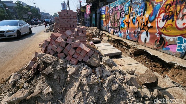 Material proyek revitalisasi menumpuk di pinggir Jalan HOS Cokroaminoto, Kreo, Larangan, Kota Tangerang, Banten, Selasa (22/8/2023).