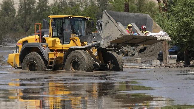 California - Badai Tropis Hilary yang menerjang California, AS, telah menyebabkan banjir lumpur. Tim penyelamat menggunakan buldoser untuk mengevakuasi warga terdampak.