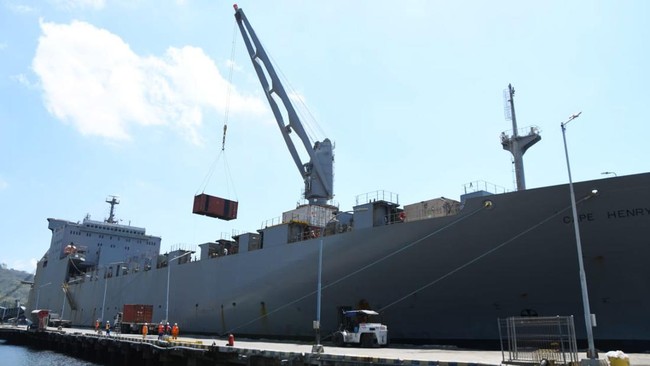 Banyuwangi - Kapal kargo AS, MV Cape Henry merapat di Dermaga Tanjungwangi, Banyuwangi. Kapal ini membawa Alutsista milik Amerika Serikat.