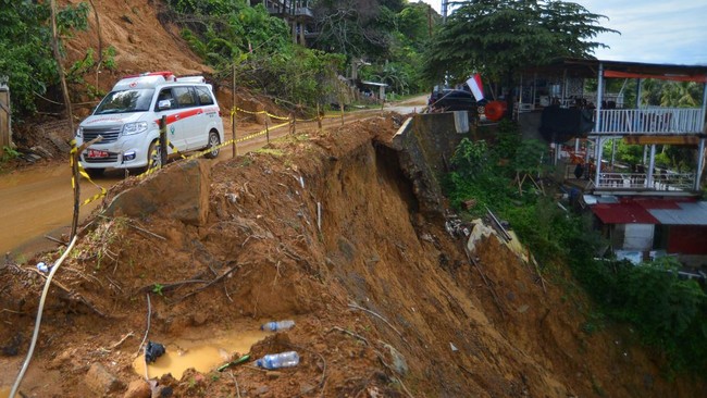 Mobil ambulans melewati jalan yang longsor di Jalan Lingkar Nipah - Teluk Bayur, di Bukit Gado-gado Padang, Sumatera Barat, Senin (28/08/2023).