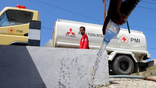Gorontalo - Kekeringan mengakibatkan warga Bone Bolango, Gorontalo, kesulitan air bersih, Rabu (30/8/2023). Tempat pendistribusian air bersih pun diserbu.