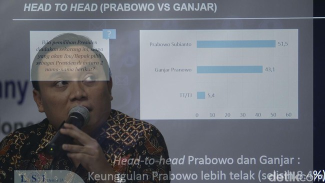 Jakarta - Lembaga survei LSI Denny JA mengeluarkan hasil survei terbaru mereka terkait elektabilitas bakal capres 2024. Prabowo masih unggul dari Ganjar.