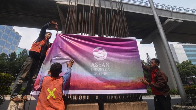 Jakarta - 100 tiang monorel mangkrak di Jalan Rasuna Said, Jakarta, ditutup spanduk guna menyambut penyelenggaraan KTT ASEAN ke-43.