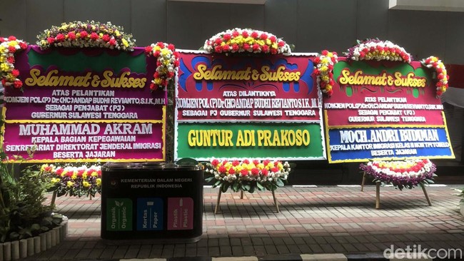 Jakarta - Karangan bunga memenuhi kantor Kemendagri, Jakarta Pusat. Karangan bunga dikirimkan saat pelantikan 9 Pj Gubernur baru.