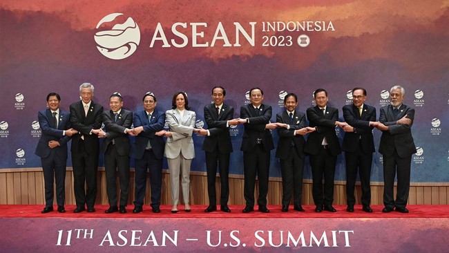Presiden Joko Widodo foto bersama sambil bergandengan tangan dengan Presiden Filipina Ferdinand Romualdez Marcos Jr, Perdana Menteri Singapura Lee Hsien Loong, Head of Delegation of The Kingdom of Thailand Sarun Charoensuwan, Perdana Menteri Vietnam Pham Minh Chinh, Wakil Presiden Amerika Serikat Kamala Harris, Perdana Menteri Laos Sonexay Siphandone, Sultan Brunei Darussalam Hassanal Bolkiah, Perdana Menteri Kamboja Hun Manet, Perdana Menteri Malaysia Dato Seri Anwar Ibrahim, dan Perdana Menteri Timor Leste Xanana Gusmao sebelum KTT ASEAN-Amerika Serikat di Jakarta, Rabu (6/9/2023). Media Center KTT ASEAN 2023/Zabur.