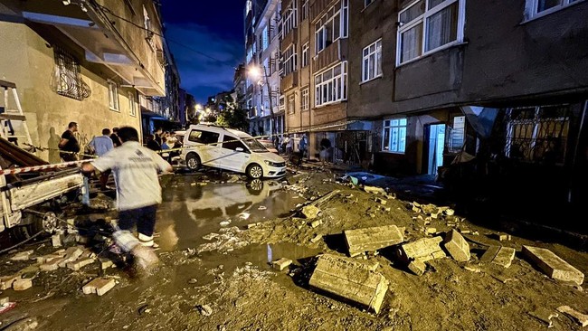 Kendaraan berserakan usai disapu banjir dahsyat akibat hujan lebat di Istanbul, Turki, Rabu (6/9/2023). Jumlah korban tewas akibat hujan badai hebat yang melanda sebagian Yunani, Turki dan Bulgaria meningkat menjadi 14 orang pada Rabu setelah tim penyelamat di tiga negara tetangga menemukan tujuh jenazah lagi. AP/Sercan Ozkurnazli