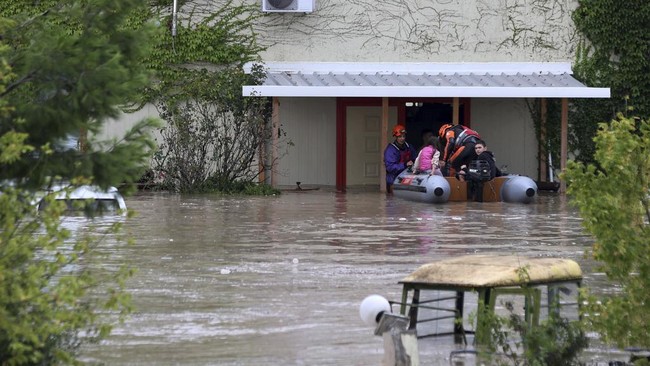 Yunani - Rekor curah hujan telah menyebabkan banjir dahsyat di Yunani. Warga pun harus dievakusi ke tempat yang lebih aman. Begini proses evakuasi tersebut.