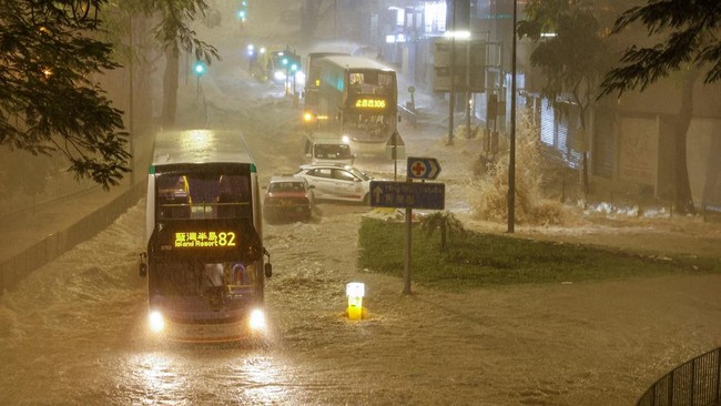 Hong Kong - Hujan lebat memicu banjir bandang di sebagian wilayah Hong Kong, Jumat (8/9/2023). Begini penampakan derasnya arus banjir yang menerjang jalanan di Hong Kong.