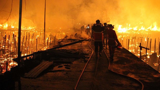 Palangkaraya - Kebakaran melanda permukiman padat penduduk di Palangkaraya, Kalimantan Tengah, Selasa (12/9/2023) malam. Begini penampakan kobaran apinya.