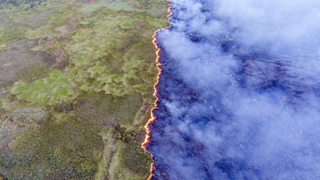 Sumatera Selatan - Kebakaran hutan dan lahan (Karhutla) masih melanda kawasan Tol Palembang-Indralaya (Palindra), Ogan Ilir, Sumsel. Angin kencang membuat api susah dipadamkan.