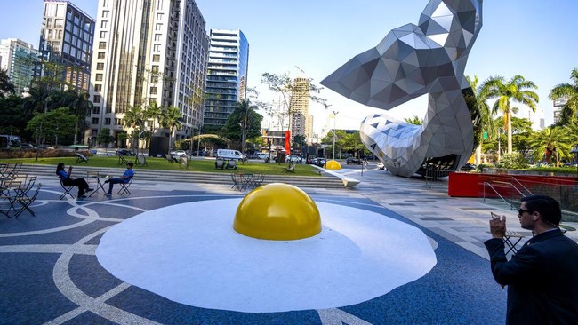Instalasi seni bertajuk "Art Eggcident" menutupi halaman di luar gedung komersial di Sao Paulo, Brasil, Rabu (20/9/2023).