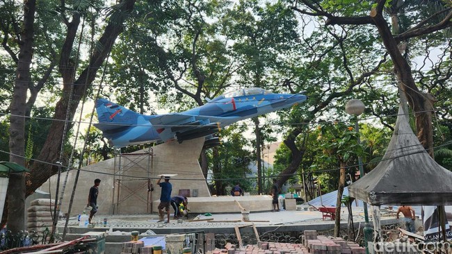 Jakarta - Monumen Swa Bhuwana Paksa tengah dibangun di Tebet, Jakarta Selatan. Di monumen tersebut terdapat replika pesawat A-4 Skyhawk warna biru khas TNI AU.