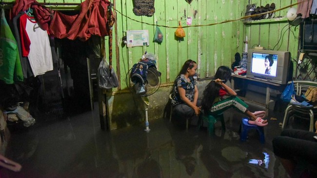 Warga menonton televisi di dalam rumahnya yang terendam banjir di Medan, Sumatera Utara, Senin (25/09/2023).