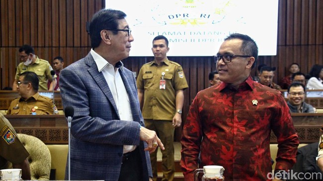 Jakarta - Menkumham Yasonna Laoly dan MenPAN-RB Abdullah Azwar Anas menghadiri raker dengan Komisi II DPR. Rapat ini membahas Revisi UU ASN.