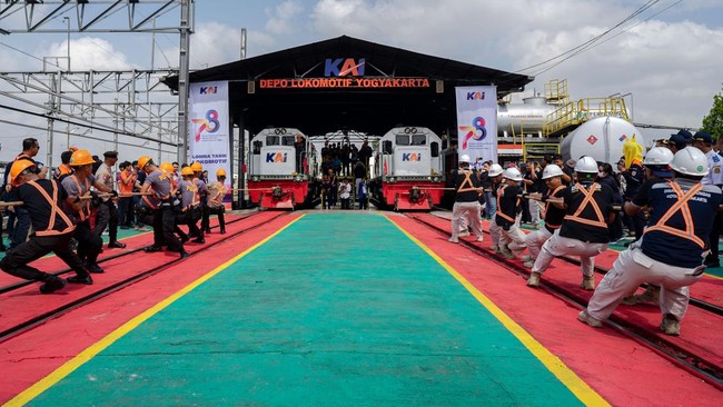 Yogyakarta - Ada lomba unik di Yogja hari ini. Bukan tarik tambang biasa, tapi tarik tambang 'melawan' lokomotif. Tak main-main, berat lokomotif yang ditarik mencapai 80 ton