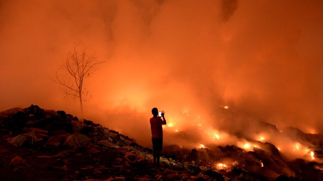 Manado - Tempat Pembuangan Akhir (TPA) Sumompo, Manado, Sulawesi Utara, terbakar, Minggu (1/10/2023). Sembilan unit mobil pemadam kebakaran diturunkan.