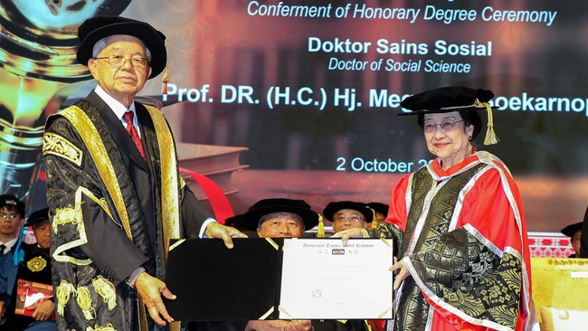 Malaysia - Ketum PDIP yang juga Presiden ke-5 RI Megawati Soekarnoputri menerima gelar doktor honoris causa dari UTAR, Malaysia, Senin (2/10). Ini momen penganugerahannya.