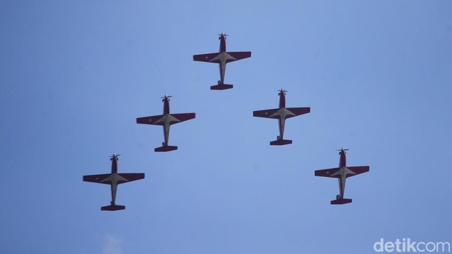 Jakarta - Tak hanya aksi penerjun, manuver jet tempur dan helikopter juga semakin memeriahkan gladi bersih HUT ke-78 TNI di kawasan Monas, Jakarta.