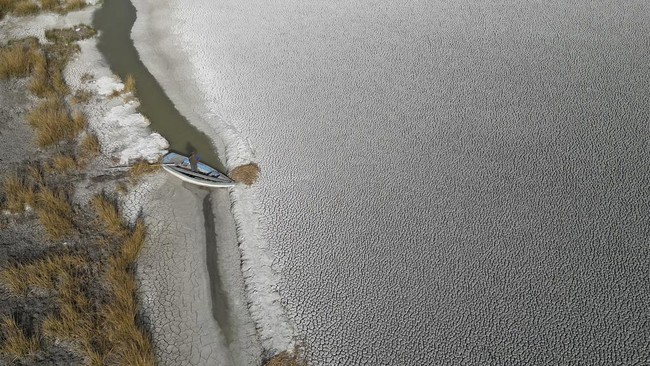 Sebuah perahu terlhat di tepi dasar Danau Titicaca yang kering dan retak, di Isla de Cojata, Bolivia, Jumat, 29 September 2023. Tepian darat yang mengering dan dalaman Danau Titicaca yang menyusut telah memicu kekhawatiran bahwa cara hidup yang telah lama ada di sekitar danau terbesar kedua di Amerika Selatan ini mulai lenyap.