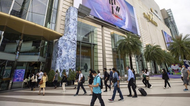 Suasana di luar Siam Paragon Mall di Bangkok, Thailand, Rabu (4/10/2023). Pengunjung nampak beraktivitas seperti biasa pasca insiden penembakan yang terjadi pada Selasa (3/10) kemarin.