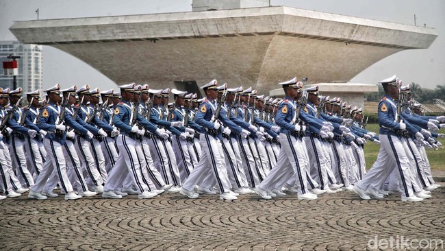 Jakarta - Peringatan HUT TNI di Monas, Jakarta, dimeriahkan dengan defile pasukan, Kamis (5/10/2023). Yuk kita lihat.