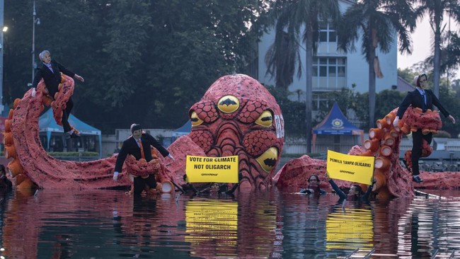 Jakarta - Greenpeace Indonesia gelar aksi di kolam Bundaran Hotel Indonesia (HI), Jakarta. Mereka membawa boneka gurita raksasa.