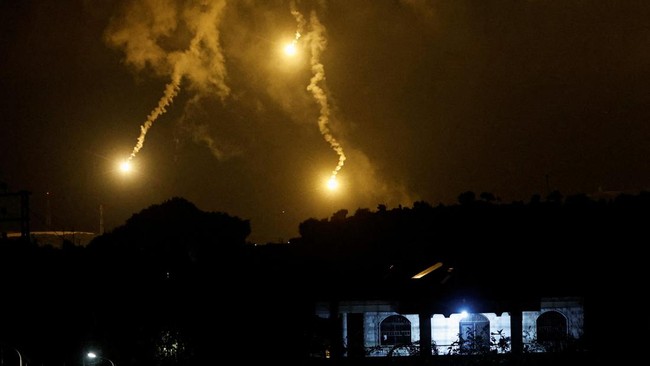Suar, ditembakkan dari sisi Israel, menyala di langit seperti yang terlihat dari Ramyah dekat perbatasan Lebanon- Israel, di Lebanon selatan, Rabu (11/10/2023). Kelompok Hizbullah yang didukung Iran di Lebanon sedang dalam kondisi perang, mengerahkan pasukan khusus dan menyiapkan roketnya sebagai persiapan menghadapi kemungkinan perang dengan Israel menyusul serangan Hamas pada Sabtu (7/10) lalu. REUTERS/Thaier Al-Sudani