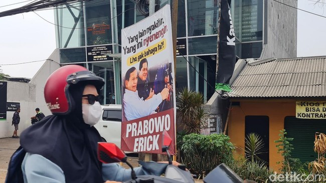 Bekasi - Menjelang pendaftaran capres cawapres spanduk bergambar wajah Prabowo Subianto dan Erick Thohir banyak terpasang di jalanan. Ini poster salah satunya.