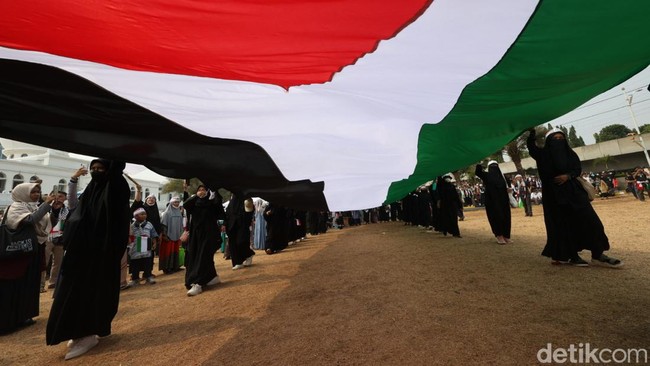 Jakarta - Aksi bela Palestina yang diikuti ribuan warga di Masjid Agung Al-Azhar, Jakarta, dilakukan dengan mengibarkan bendera Palestina Raksasa.