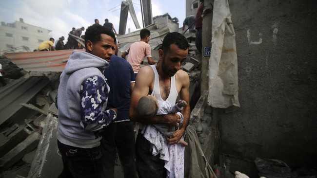 Gaza - Tim penyelamat dan warga terus melakukan evakuasi korban yang tertimbun reruntuhan akibat serangan Israel di Gaza. Di antara korban yang dievakuasi adalah bayi.
