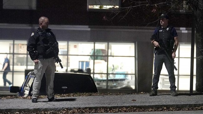 Polisi bersenjata disiagakan usai penembakan massal yang menewaskan sedikitnya 22 orang di Maine, Amerika Serikat. AP Photo/Steven Senne.