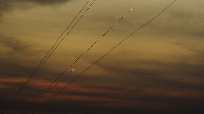 Israel - Hamas menembakkan roketnya di tengah perang melawan Israel yang telah memasuki hari ke-21. Roket yang ditembakkan itu terlihat beterbangan di langit Israel.