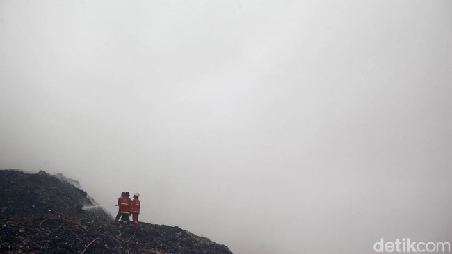 Petugas menyemprotkan cairan ke titik api yang membakar Tempat Pembuangan Akhir (TPA) Rawa Kucing, Kecamatan Neglasari, Kota Tangerang. Pemkot Tangerang menyatakan status darurat bencana hingga 2 November mendatang.