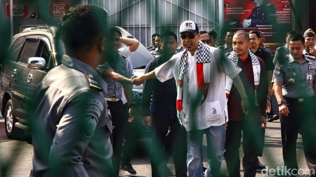 Pantauan detikcom di Lapas Kelas IIA Salemba, Jakarta Pusat, Senin (30/10/2023), Munarman terlihat mengenakan topi bertuliskan Save Palestine.