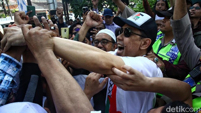 Jakarta - Riuh kegembiraan terjadi saat massa menyambut pembebasan Mantan Jubir FPI, Munarman di Lapas Salemba Jakarta. Begini ekspresi warga saat menyambut Munarman.