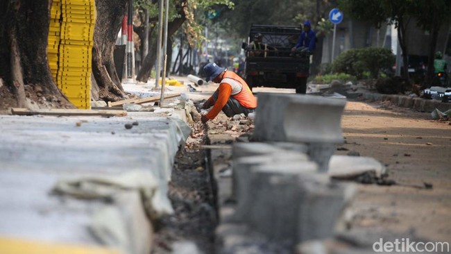 Jakarta - Trotoar di kawasan Pulo Gadung, Jakarta Timur, sedang ditata. Trotoar ini akan membentang hingga Velodrome.