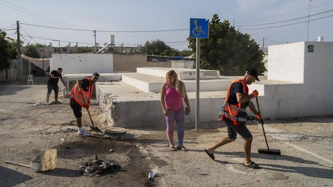 Pekerja kota membersihkan puing-puing beberapa hari setelah sebuah roket yang ditembakkan dari Jalur Gaza menghantam dekat tempat perlindungan bom di Ashkelon, Israel, Selasa, 31 Oktober 2023.
