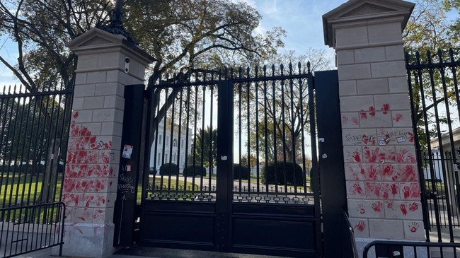 Amerika Serikat - Massa Pro-Palestina menghiasi pintu masuk Gedung Putih AS dengan cap tangan berwarna merah. Aksi ini untuk melambangkan tewasnya warga Palestina.