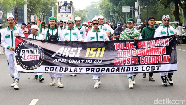 Jakarta - Coldplay akan menggelar konser di Stasion GBK, Rabu (15/11) malam. Namun menjelang konser, massa Gerakan Nasional Anti (Geranati) LGBT menggelar aksi penolakan.