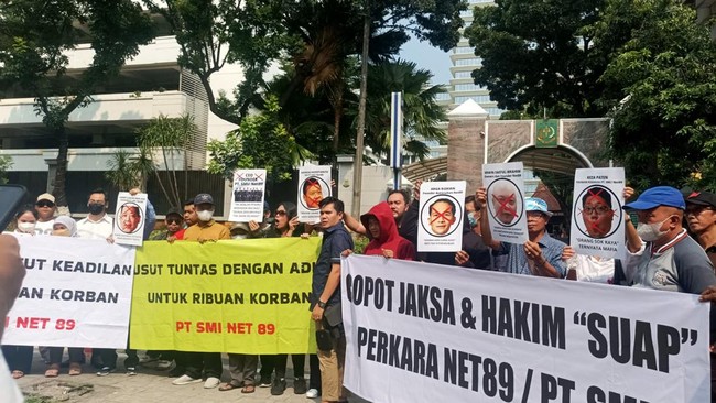 Jakarta - Paguyuban korban robot trading Net 89 menggelar aksi menuntut keadilan di Gedung Kejaksaan Agung Jakarta. Begini potretnya.