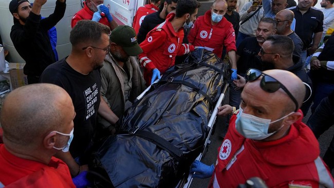 Petugas Palang Merah Lebanon membawa jenazah Rabih Maamari di sebuah rumah sakit di Beirut. Rabih Maamari merupakan kameramen TV Al Mayadeen. AP Photo/Bilal Hussein.