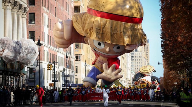 Balon Monkey D. Luffy terbang pada Parade Hari Thanksgiving Macy ke-97 di Manhattan, New York City, Amerika Serikat, Kamis (23/11/2023). (REUTERS/Mike Segar)