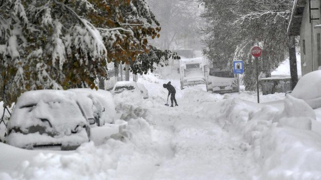 Bulgaria - Badai musim dingin yang dahsyat menyebabkan hujan salju di Bulgaria, Minggu (27/11/2023) waktu setempat. Bahkan salju juga menyelimuti jalanan hingga rumah.