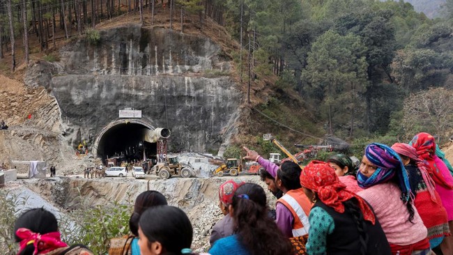 India - Proses evakuasi 41 pekerja tambang yang terjebak di terowongan di Uttarkashi, India, jadi tontonan warga. Mereka juga berdoa untuk kelancaran evakuasi.