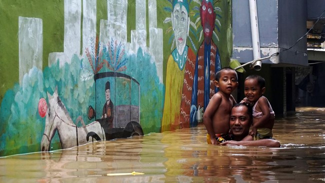 Seorang warga dan dua anaknya melintasi jalanan yang terendam banjir di Kebon Pala, Kampung Melayu, Jakarta.