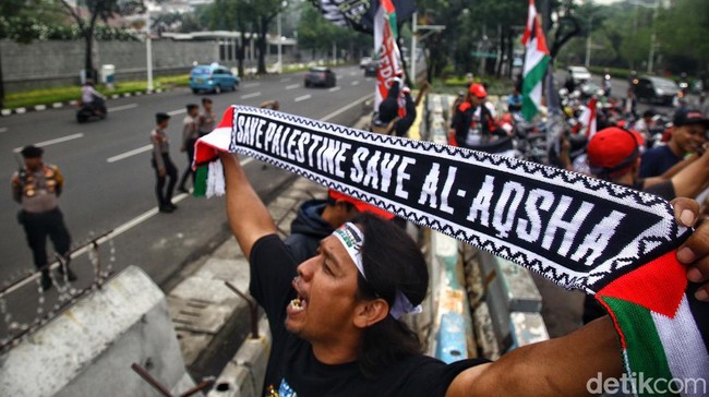 Jakarta - Massa dari berbagai elemen pelajar dan masyarakat menggelar aksi unjuk rasa di depan Kedubes AS Jakarta. Mereka menyatakan dukungan untuk Palestina.