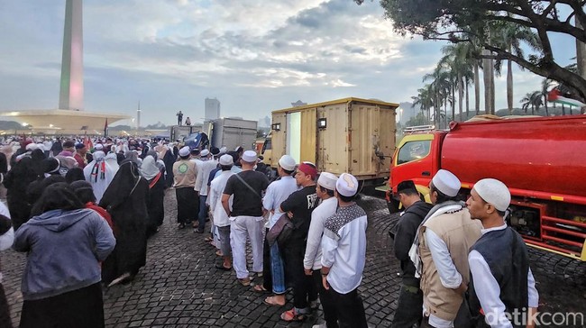 Jakarta - Aksi Munajat Kubro 212 berlangsung di Monas. Disela-sela aksi tersebut, atrean toilet tampak panjang.